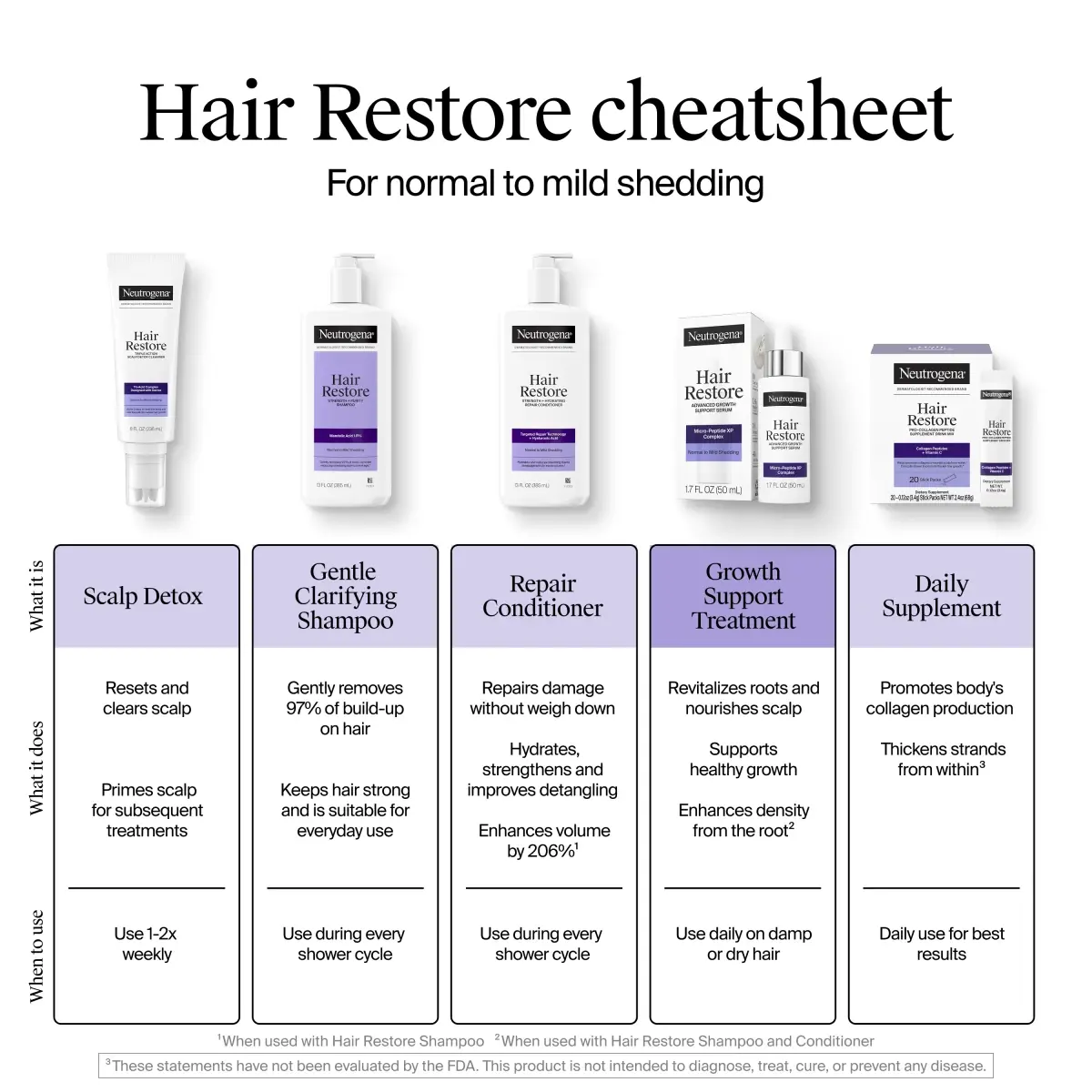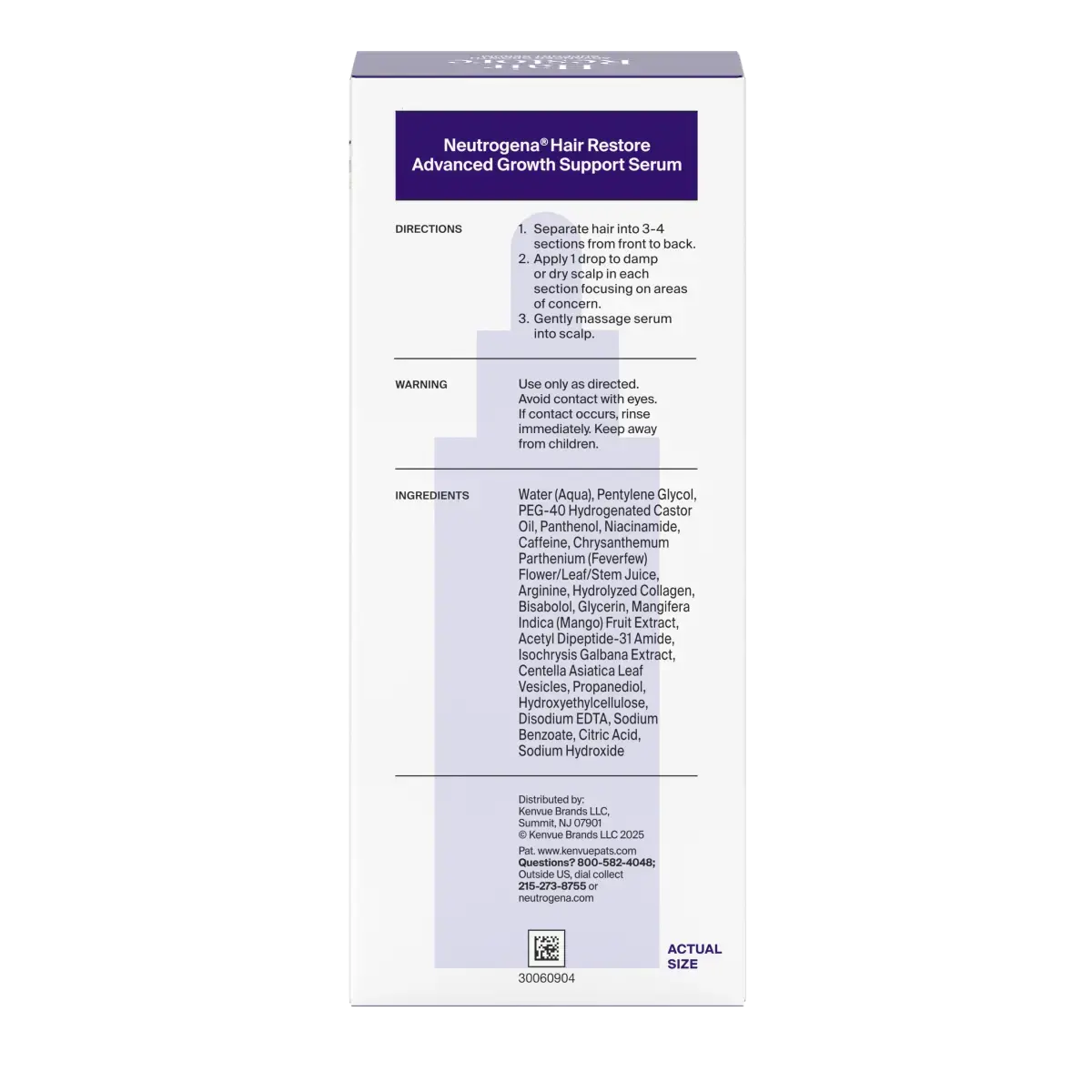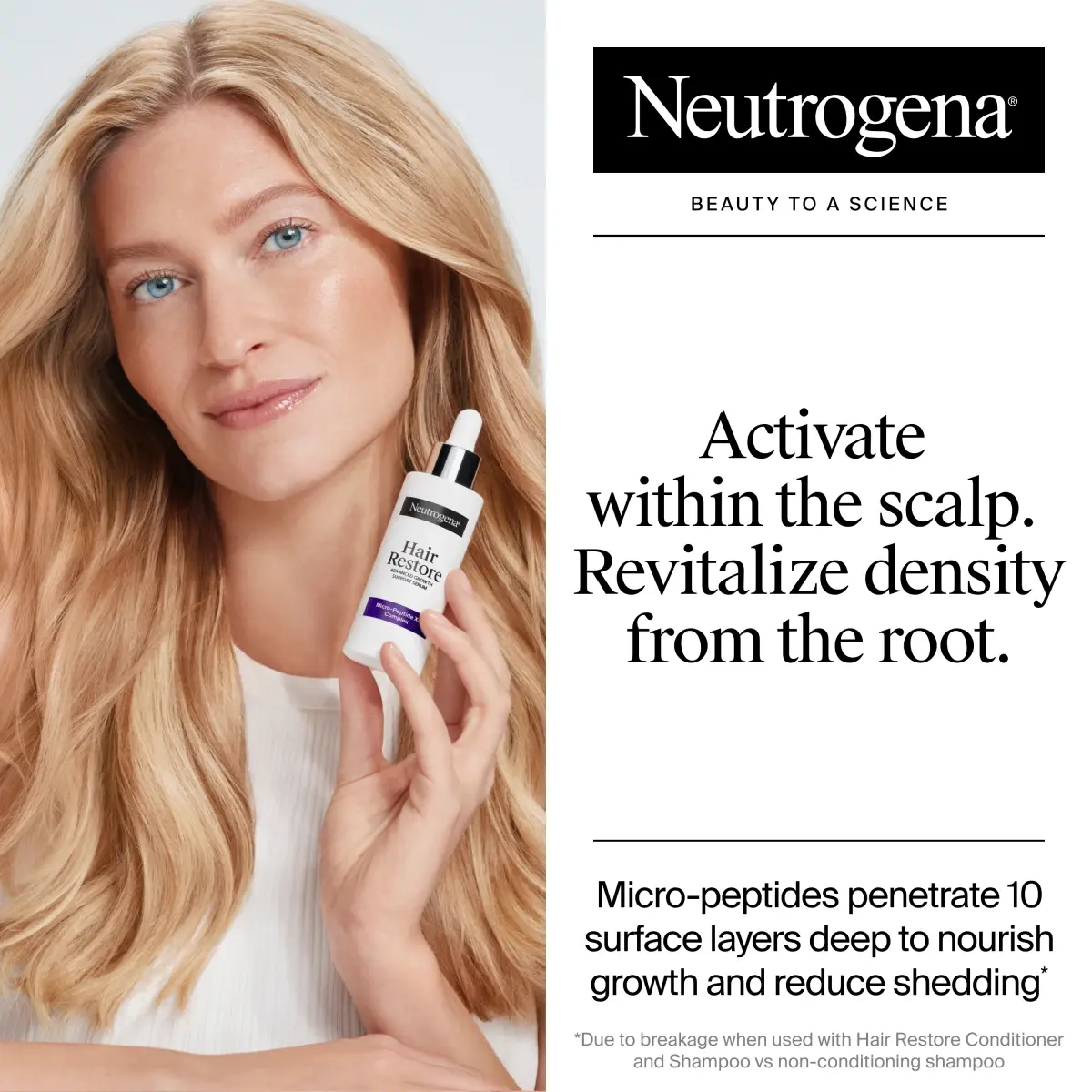 Activate scalp to revitalize visible density from the root. Deeply nourish the scalp to support natural growth & reduce shedding3 with Hair Restore Advanced Growth Support Serum. Designed with dermatologists, this serum has a patent-pending micro-peptide XP complex with peptides that are 1.8x smaller² to penetrate 10 surface layers deep to revitalize roots & reduce shedding due to breakage by 41%³. Formulated with 10 core ingredients including feverfew, niacinamide, caffeine, arginine, & hydrolyzed collagen to support hair growth. From Neutrogena, a dermatologist recommended brand, this water-based, non-greasy formula absorbs into the scalp & doesn’t sit on the surface or clog follicles. To incorporate into your routine, divide your hair into 3-4 sections & apply 1 drop to a dry or damp scalp, focusing on areas of concern. Massage in thoroughly. ¹due to breakage ²compared to peptides in leading scalp serums ³when used with Hair Restore Shampoo & Conditioner vs non-conditioning shampoo