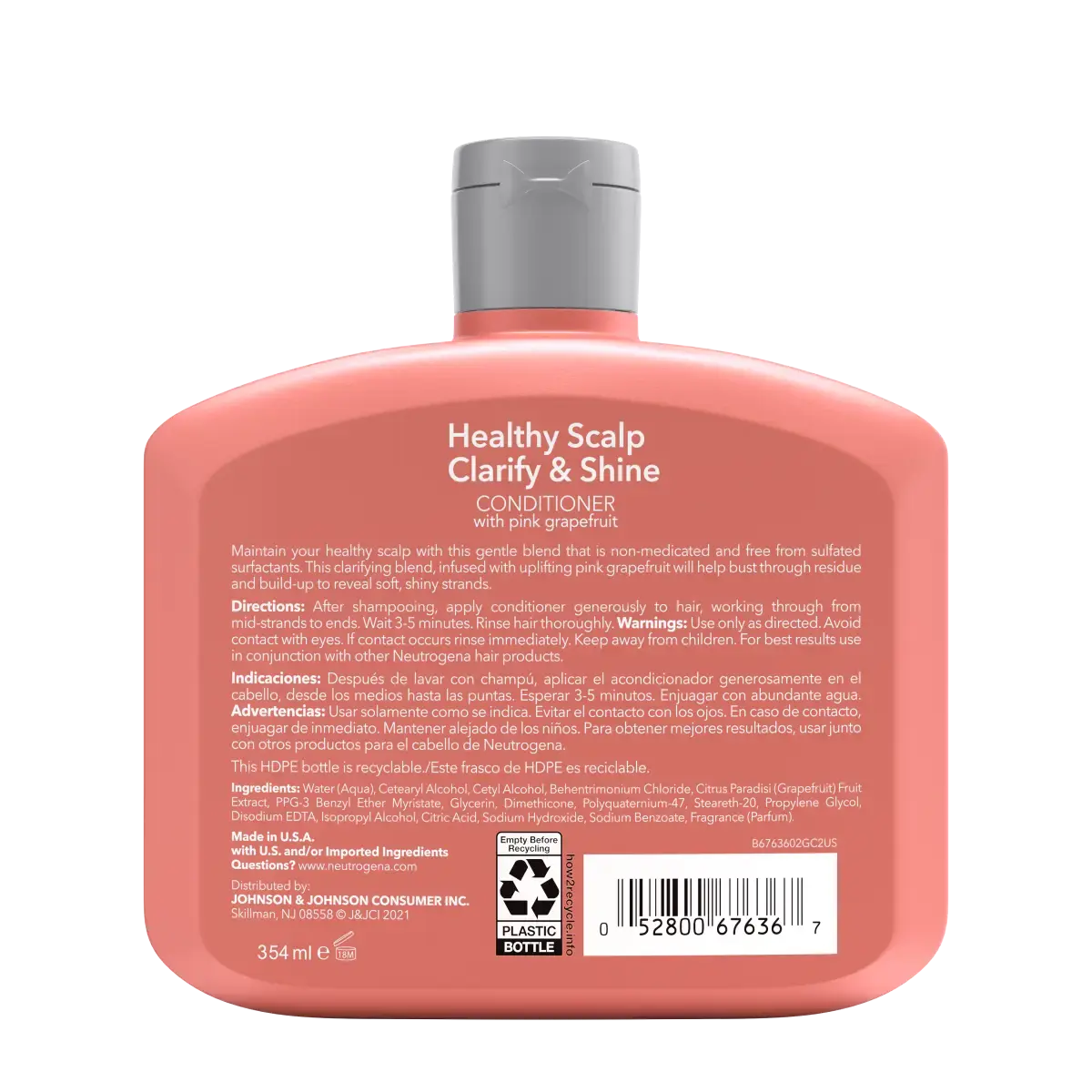 Neutrogena Healthy Scalp Clarify and Shine Conditioner with Pink Grapefruit clarifies and conditions hair and scalp in one simple step. Made especially for oily hair and scalp but suitable for all hair types including straight, wavy and curly hair, this clarifying conditioner helps gently exfoliate residue and build-up, promoting a healthy scalp and hair. It is formulated with a refreshing burst of pink grapefruit. The gentle non-medicated haircare formula is also free from phthalates, parabens, SLS, SLES and sulfated surfactants. This nourishing color-safe conditioner is designed to reveal shiny, healthy-looking, radiant hair while helping maintain scalp's natural barrier, with regular use. For best results, pair this pH-balanced and non-drying conditioner with the Clarify and Shine Shampoo and for a full self-care routine, combine with the refreshing skincare products in the Pink Grapefruit line for body and face.