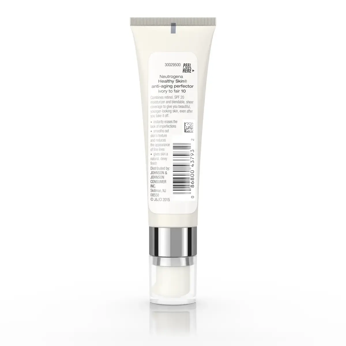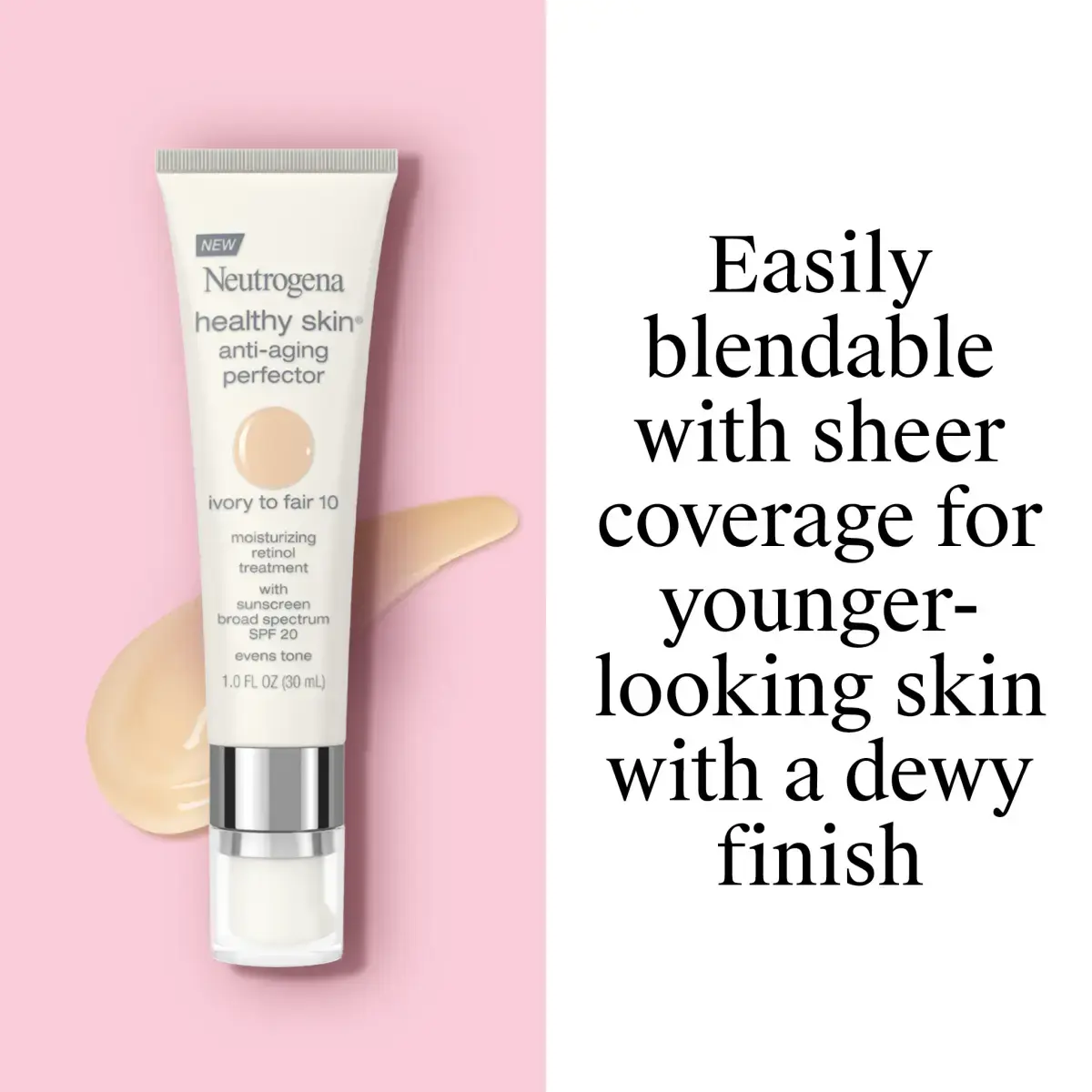 Use Neutrogena Healthy Skin Anti-Aging Perfector Tinted Facial Moisturizer with SPF 20 sunscreen to help reduce the appearance of fine lines. This all-in-one daily moisturizer combines the anti-aging properties of retinol with an SPF 20 moisturizer to offer blendable sheer coverage that helps even tone and smooth skin's texture while protecting against skin-damaging sunrays. This tinted moisturizer is enriched with clinically proven retinol treatment as well as vitamins and antioxidants to fight the appearance of wrinkles even after you take it off. Neutrogena Healthy Skin Anti-Aging Perfector SPF 20 works across skin tones for a natural, dewy finish with sheer coverage.