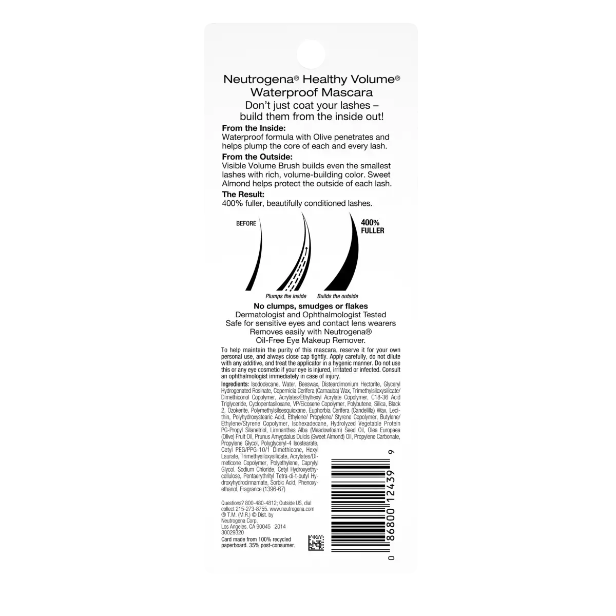 Build beautiful lashes from the inside out with Neutrogena Healthy Volume Waterproof Mascara. From the inside, this rich waterproof formula penetrates and helps plump the core of every lash. On the outside, the Super-Sized Visible Volume brush coats each lash with bold, volume-building color--no clumps, smudges, or flakes. The volumizing mascara formula contains olive oil for 400 percent fuller, more beautifully conditioned lashes, and sweet almond to protect the outside of each lash, plus the waterproof formula means your look will last longer. This dermatologist- and ophthalmologist-tested mascara is safe for sensitive eyes and contact lens wearers. Easily remove the mascara with the Neutrogena Oil-Free Eye Makeup Remover.