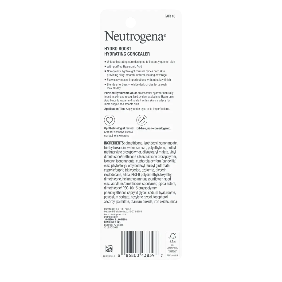Hydrate & refresh your dry, thirsty skin with Neutrogena Hydro Boost Hydrating Concealer Stick. The lightweight concealer stick features a hydrating core designed to instantly quench skin & flawlessly masks facial imperfections, such as redness & dark under-eye circles, without a cakey finish. The cover-up is formulated with purified hyaluronic acid, an essential hydrator naturally found in skin that binds to water & holds it within skin's surface, to leave skin feeling quenched & more supple & smooth. This concealer is non-greasy, oil-free, & non-comedogenic & has a lightweight formula that glides onto skin providing silky-smooth, natural-looking coverage. To use in your daily beauty routine, apply the full coverage concealer under your eyes or to any facial imperfections. It has been ophthalmologist tested & is safe for sensitive eyes & contact lens wearers. The hydrating concealer stick is available in five blendable shades designed to match multiple skin tones.