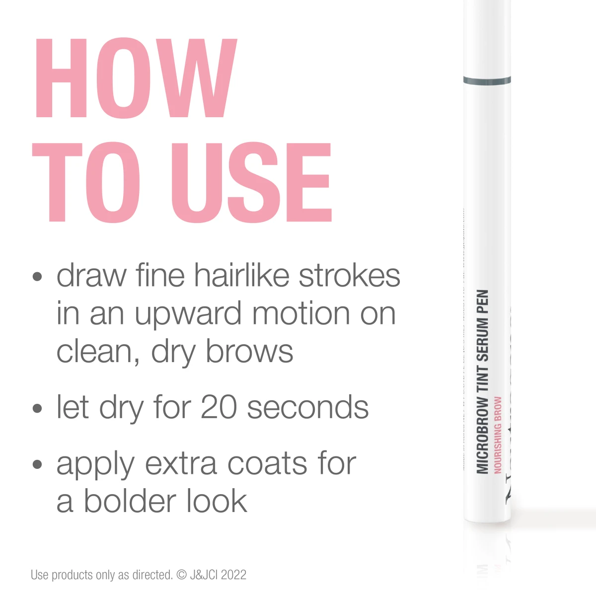 Apply fine hair-like strokes in an upward motion on clean, dry brows. Apply additional coats for a bolder look. Let dry for 20 seconds.