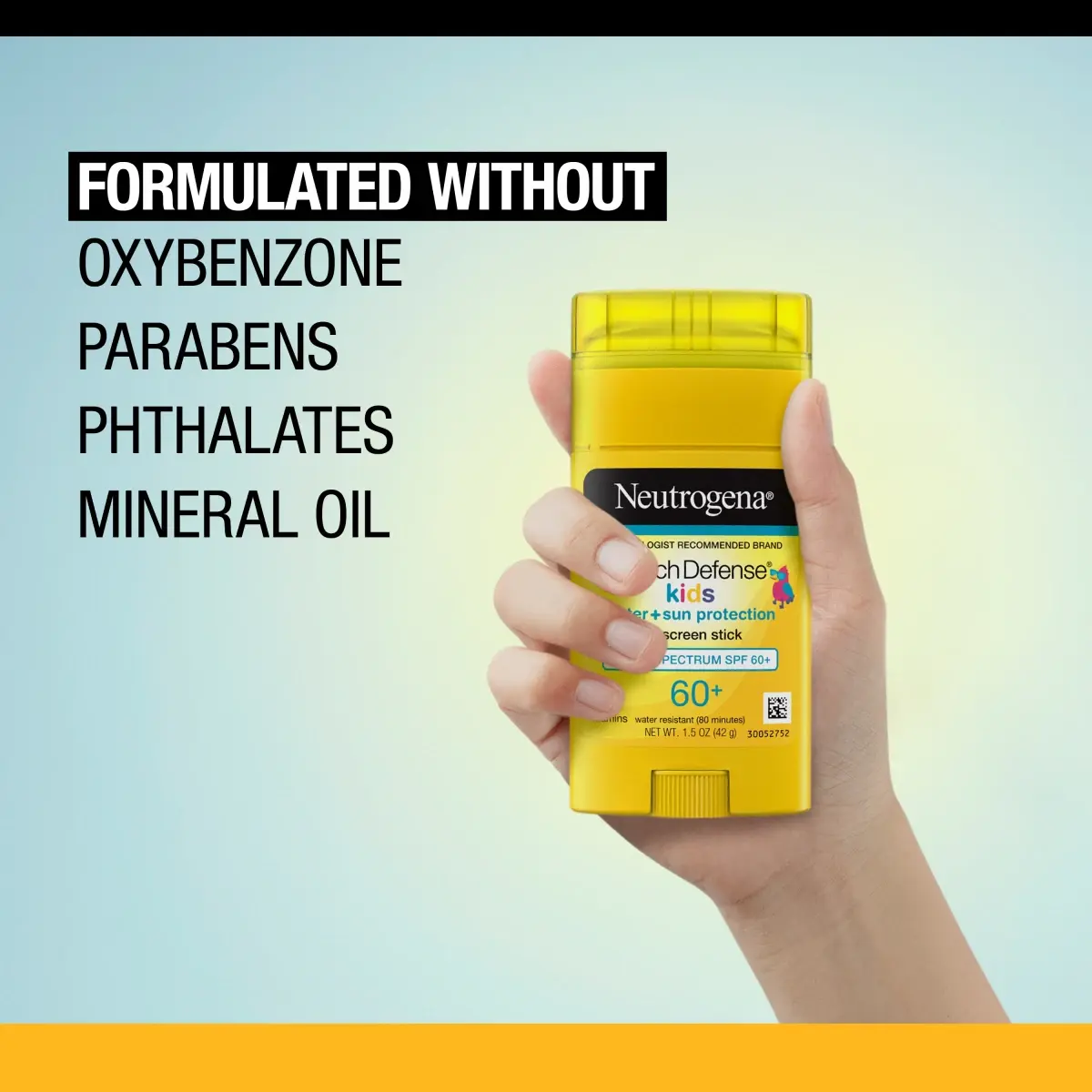 Get ready for fun in the sun with Neutrogena Beach Defense Kids Sunscreen Stick, SPF 60+! Ideal for active families, this mini sunscreen kids formula is perfect for easily reapplying throughout the day, ensuring continuous protection. Glides on smoothly for a hands-free, no-mess application, allowing kids to play without delays. Stick sunscreen for face & body application is smooth & clear, leaving no residue behind. Helioplex Technology provides beach strength UVA/UVB sun protection, ideal for beach outings and extended sun exposure. PABA-free, Lightweight and water-resistant for up to 80 minutes, it's great for kids enjoying the water. Apply this Neutrogena sunscreen stick, from the derm-recommended sun care brand, before sun exposure to keep your little ones' skin protected during beach days. While "reef-safe" is not a standardized term and is defined differently by each manufacturer, our sunscreens are Hawaii Reef Act 104 compliant - Oxybenzone and Octinoxate free.