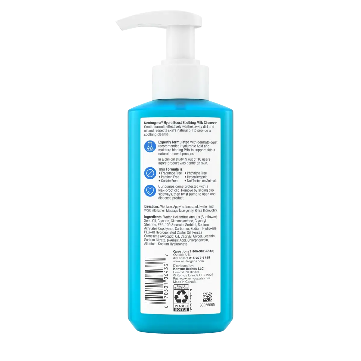 Neutrogena Hydro Boost Face Wash Soothing Milky Cleanser & Makeup Remover gently lifts away dirt and oil to leave skin soft and soothed. The milk facial cleanser from a dermatologist-recommended brand respects skin's natural pH to provide a gentle, soothing cleanse. This Neutrogena face wash is formulated with hyaluronic acid and glycerin, making it a good face wash for dry skin. Moisture binding Polyhydroxy Acid (PHA), a gentle exfoliator, supports skin’s natural renewal process. Clinically tested, this gentle face cleanser is hypoallergenic and not tested on animals. The sensitive skin face wash is free of fragrances, parabens, sulfates and phthalates. To use as part of your daily skincare routine, wet face, apply the hydrating facial cleanser to hands, add water, and work into a lather. Massage face gently with the wash and then rinse thoroughly. For even more hydration, pair with other facial skin care products from the Neutrogena Hydro Boost line.