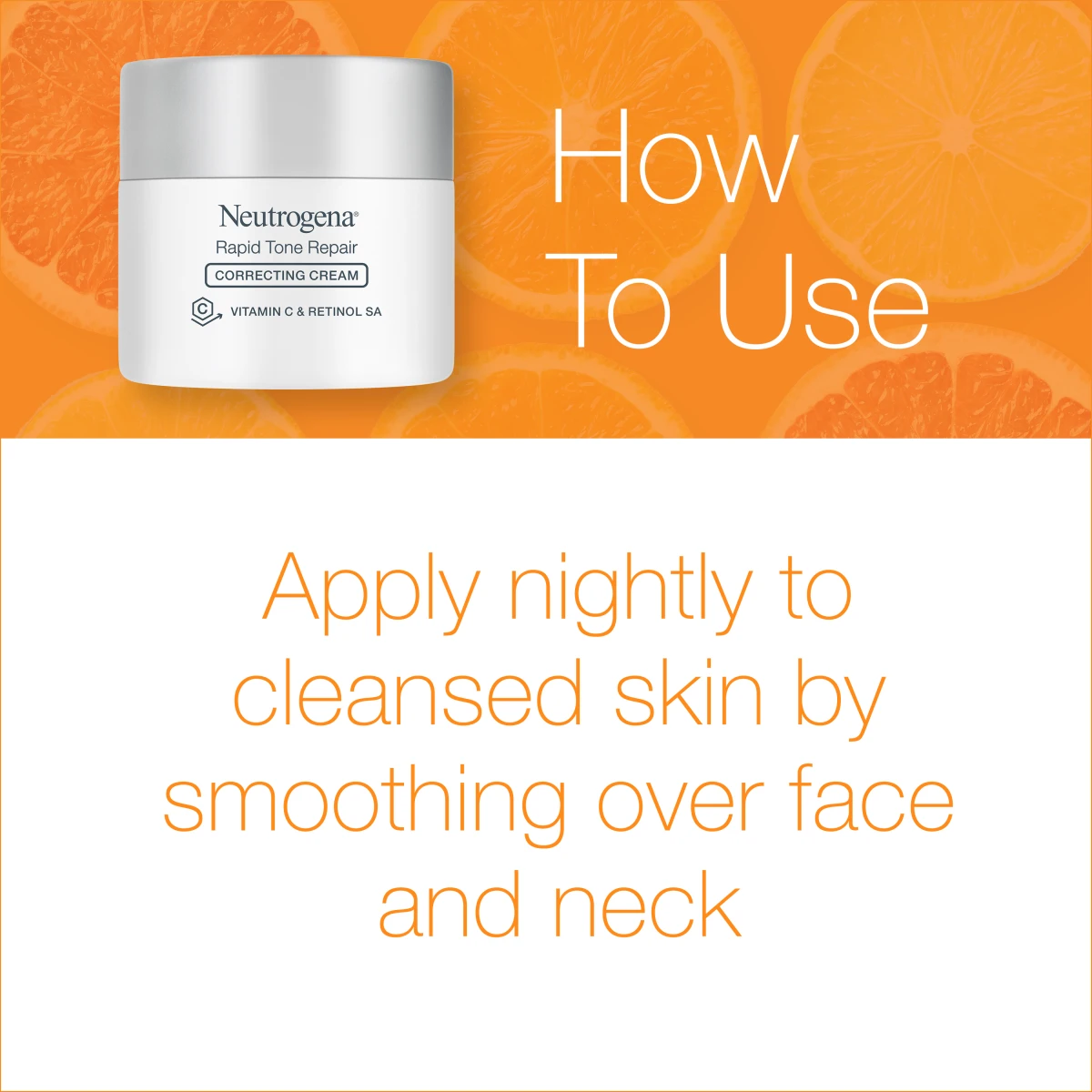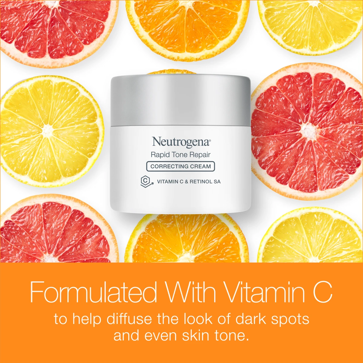 Visibly brighten, smooth, and even your complexion with Neutrogena Rapid Tone Repair Retinol + Vitamin C Correcting Cream. This brightening, anti-aging moisturizer helps reduce the look of dark spots, wrinkles, and discoloration for a more radiant, youthful glow. Clinically proven, this tone evening cream combines pure retinol, a dermatologist-proven form of vitamin A that targets fine lines and dullness, with vitamin C, an antioxidant known to diffuse the look of dark spots and improve skin tone. Infused with hyaluronic acid and glycerin, this moisturizer delivers plumping, long-lasting hydration to smooth and refresh skin texture. Formula free from parabens, mineral oil, and dyes, this daily retinol cream works to rejuvenate dull, aging skin while maintaining moisture balance. Apply evenly to cleansed face and neck once or twice daily as part of your AM or PM skincare routine for visibly renewed, glowing skin.