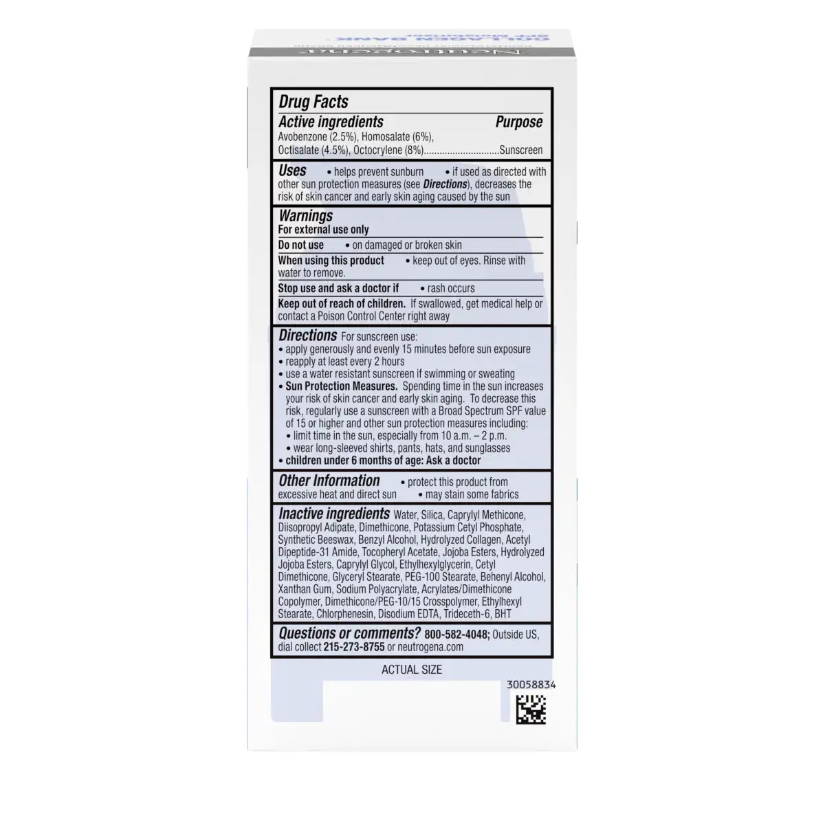 For sunscreen use • apply generously and evenly 15 minutes before sun exposure • reapply at least every 2 hours • use a water resistant sunscreen if swimming or sweating • Sun Protection Measures. Spending time in the sun increases your risk of skin cancer and early skin aging. To decrease this risk, regularly use a sunscreen with a Broad Spectrum SPF value of 15 or higher and other sun protection measures including: • limit time in the sun, especially from 10 a.m. – 2 p.m. • wear long-sleeved shirts, pants, hats, and sunglasses • children under 6 months of age: Ask a doctor. Other Information • protect this product from excessive heat and direct sun • may stain some fabrics. Questions or comments? 800-582-4048; Outside US, dial collect 215-273-8755 or neutrogena.com.