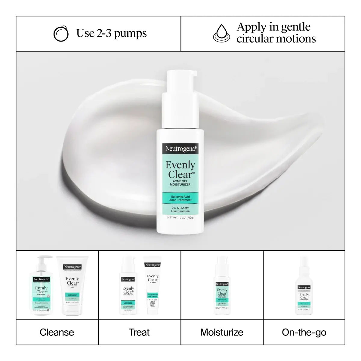Treat adult acne the effective way with Neutrogena Evenly Clear Acne Gel Moisturizer. This lightweight, fast-absorbing gel moisturizer combines 0.5% Salicylic Acid to treat and help prevent breakouts with 2% N-Acetyl Glucosamine to visibly fade the look of post-acne marks and improve skin clarity. Clinically proven, in just 1 week, users see an improvement in pimple size, skin smoothness, and radiance. With continued use, post-acne marks appear diminished while 24-hour hydration helps strengthen the skin’s moisture barrier. The non-greasy formula absorbs quickly, leaving oily, acne-prone skin feeling soft, balanced, and refreshed without clogging pores. This lightweight, non-comedogenic face moisturizer absorbs quickly, is free of fragrances and dyes, and is suitable for daily use on acne-prone, oily, and combination skin. Reveal clear, smooth, even-looking skin over time.
