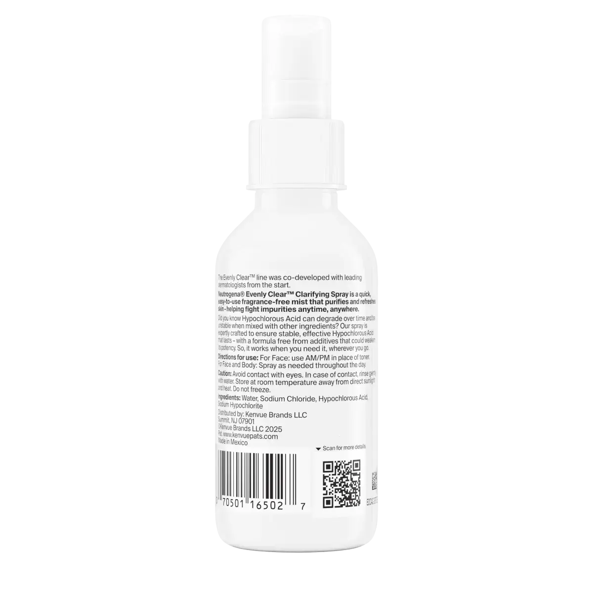 Neutrogena Evenly Clear Clarifying Spray purifies and refreshes acne-prone skin on face and body.