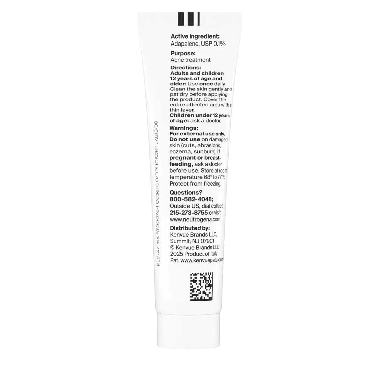 Treat adult acne the effective way with Neutrogena Evenly Clear Retinoid Adapalene Gel 0.1%. Previously available only by prescription, this once-daily topical retinoid is shown to clear acne and prevent breakouts. In just 2 weeks, you’ll see clearer skin; by week 8, skin looks renewed with a refined complexion. Developed by dermatologists, this retinoid helps support and normalize skin cell turnover to keep pores from clogging that lead to breakouts, helping achieve consistently clear, even-toned skin by week 12. Suitable for daily use on acne-prone, oily, and combination skin, the lightweight, oil-free, and fragrance-free gel layers well under makeup and absorbs quickly. Apply a thin layer to the entire affected area once a day after cleansing. For best results, use daily and limit sun exposure while using retinoids.