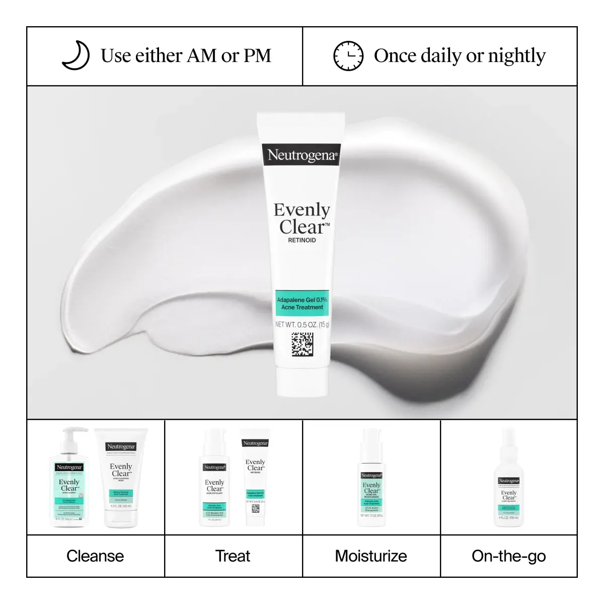 Neutrogena Evenly Clear Retinoid Adapalene Gel clears acne & visibly fades acne marks over time.