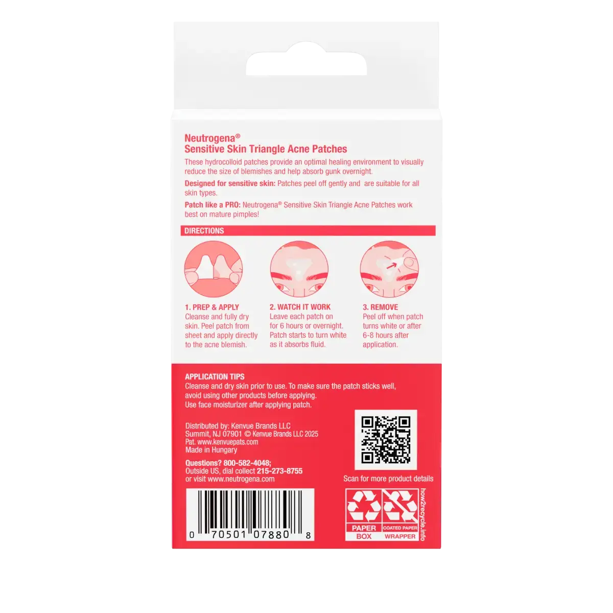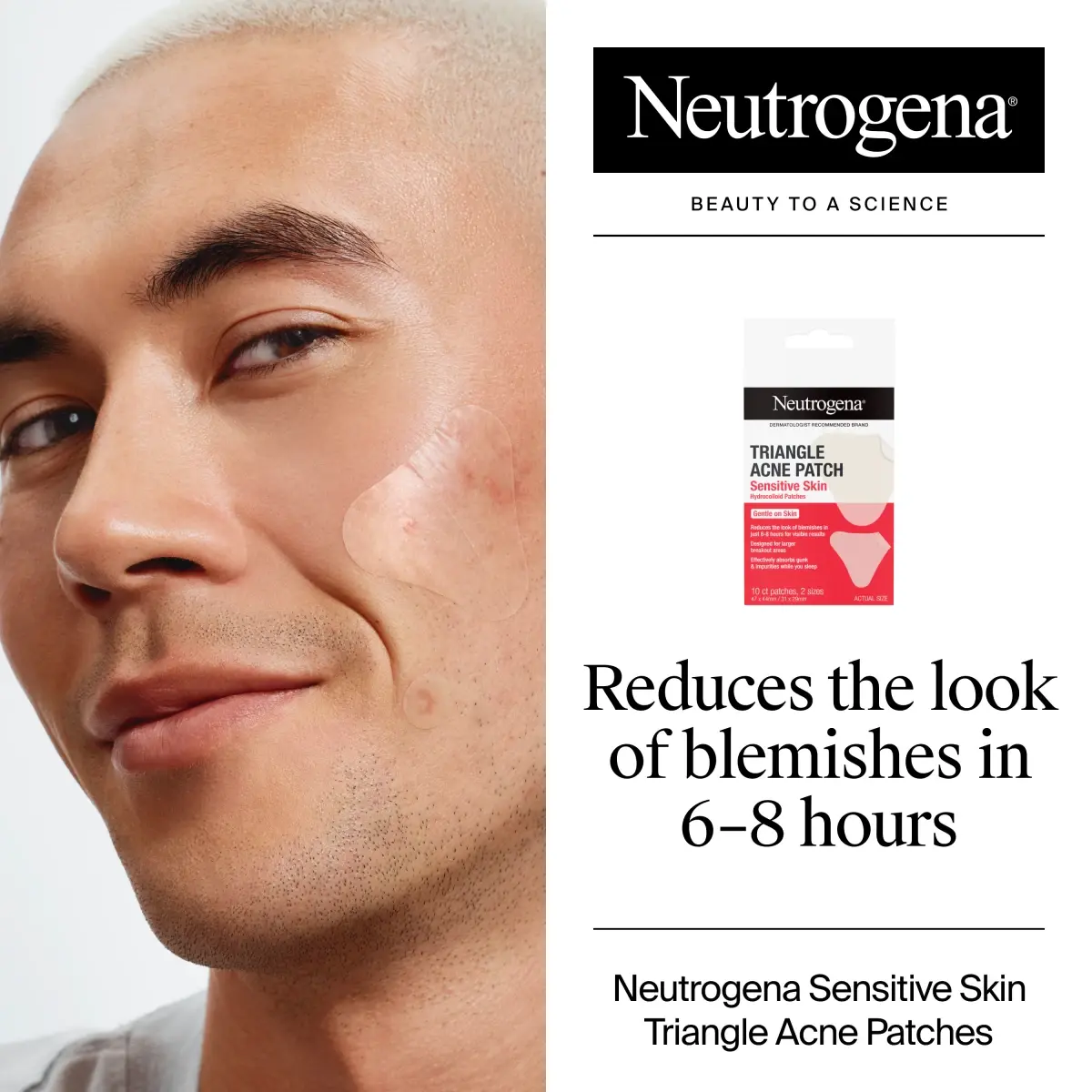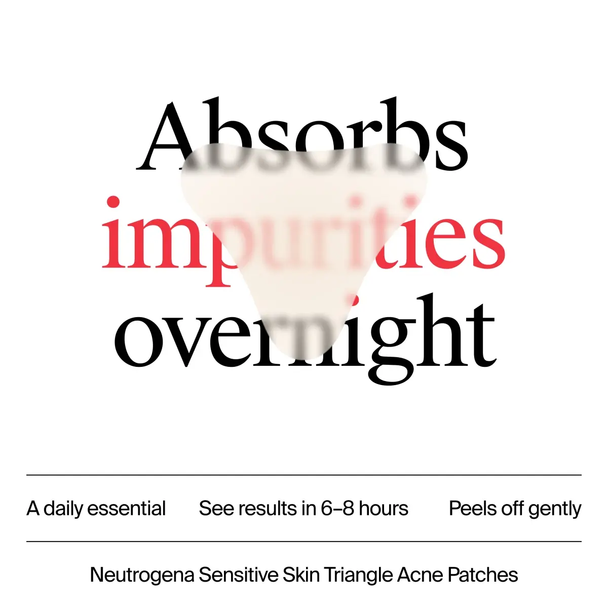 Shrink the look of blemishes in just 6-8 hours with Neutrogena Sensitive Skin Triangle Acne Patches. Designed for sensitive skin, these hydrocolloid patches from Neutrogena, a dermatologist recommended brand, create an optimal healing environment that works to help visibly reduce the size of the blemishes, and absorb gunk and impurities from the skin. Designed for larger breakout areas, these non-medicated, peel-off patches are gentle on the skin and suitable for all skin types, including sensitive skin. To use, cleanse, and fully dry the skin. Remove the backing of the patch and place directly on to the acne blemish. The facial patch starts to turn white after it absorbs fluid; peels off when the hydrocolloid patch turns white or after 6-8 hours of application. Avoid using other topical skincare products before application, use moisturizer after facial patch is applied.