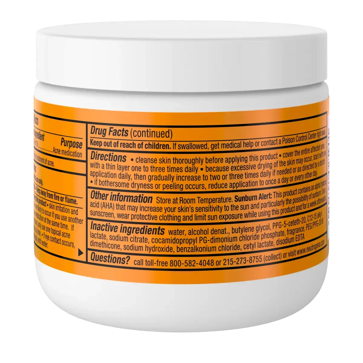 Cleanse skin thoroughly before applying this product. Cover the entire affected area with a thin layer one to three times daily. Because excessive drying of the skin may occur, start with one application daily, then gradually increase to two or three times daily if need or as directed by a doctor. If bothersome: dryness or peeling occurs, reduce application to once a day or every other day. Other information: Store at Room Temperature. Sunburn Alert: This product contains an alpha hydroxy acid (AHA) that may increase your skin's sensitivity to the sun and particularly the possibility of sunburn. Use a sunscreen, wear protective clothing and limit sun exposure while using this product and for a week afterwards. Questions? call toll-free 800-582-4048 or 215-273-8755 (collect) or visit www.neutrogena.com
