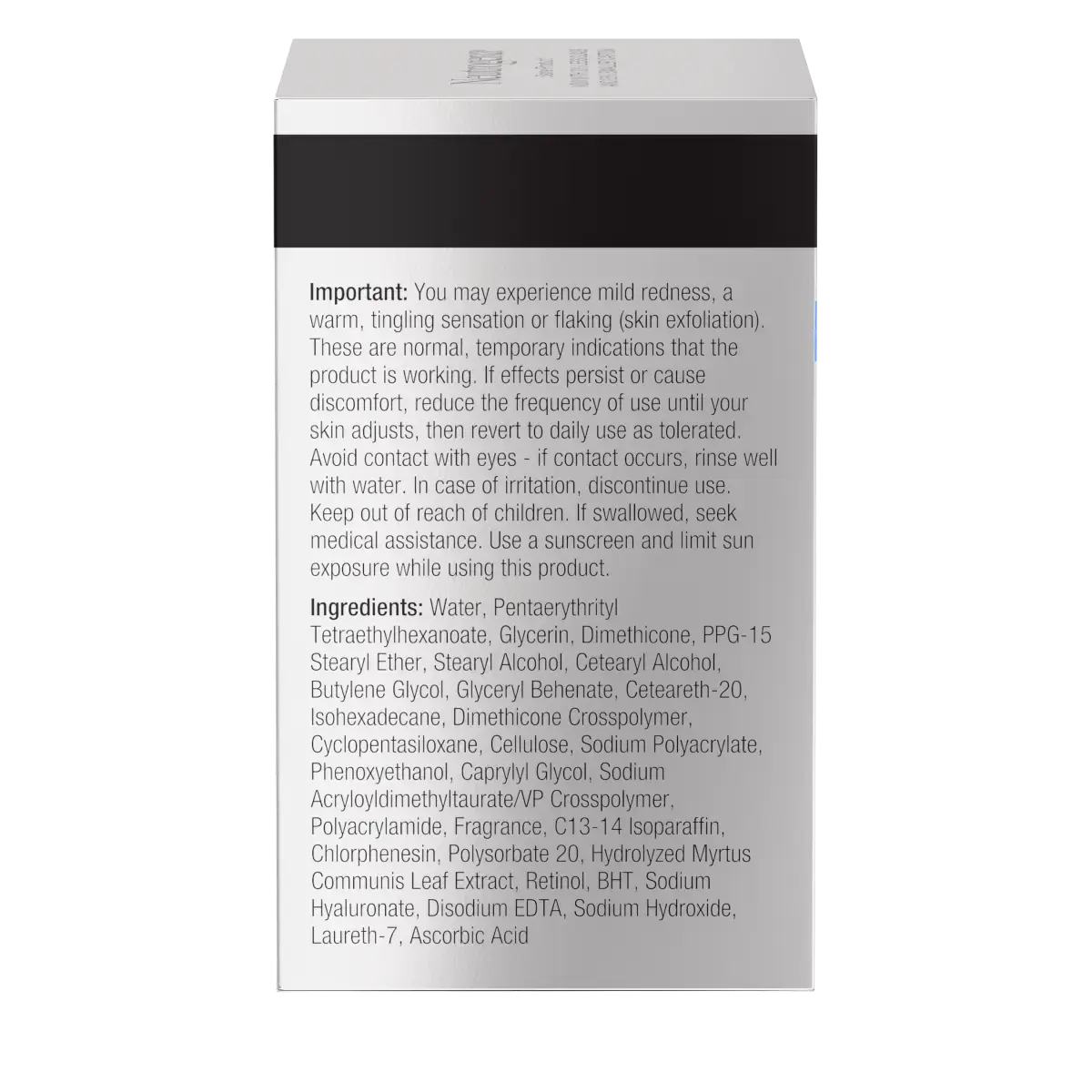 Important: You may experience mild redness, a warm, tingling sensation or flaking (skin exfoliation). These are normal, temporary indications that the product is working. If effects persist or cause discomfort, reduce the frequency of use until your skin adjusts, then revert to daily use as tolerated. Avoid contact with eyes - if contact occurs, rinse well with water. In case of irritation, discontinue use. Keep out of reach of children. If swallowed, seek medical assistance. Use a sunscreen and limit sun exposure while using this product