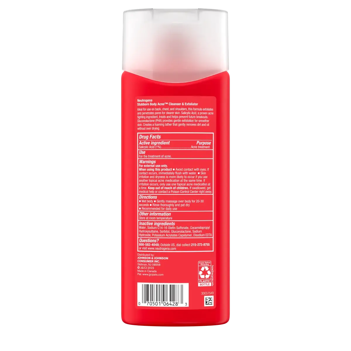 Gently cleanse and exfoliate acne-prone skin while clearing up and helping prevent breakouts with Neutrogena Stubborn Body Acne Cleanser & Exfoliator with Salicylic Acid, a BHA, and PHA. Ideal for use on the back, chest and shoulders, this acne body wash from a dermatologist-recommended brand is formulated with dermatologist tested ingredients. 1% salicylic acid, a proven acne fighting ingredient to treat and help prevent future breakouts, and gluconolactone (PHA) to provide gentle exfoliation, for smoother, clearer skin. Effective formula made without fragrances, exfoliates and penetrates pores for clearer skin. The lathering body acne wash gently removing dirt and oil without over drying skin, making it a great addition to your daily skin care routine. To help prevent blemishes, pimples, and future breakouts, use this stubborn acne shower gel daily. Wet body, gently massage body wash over body for 20 to 30 seconds, rinse thoroughly, and pat dry.