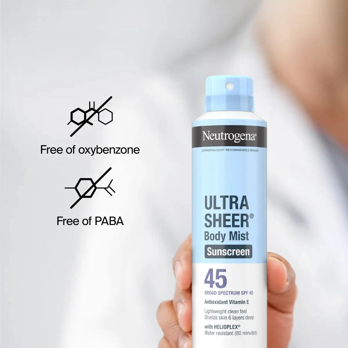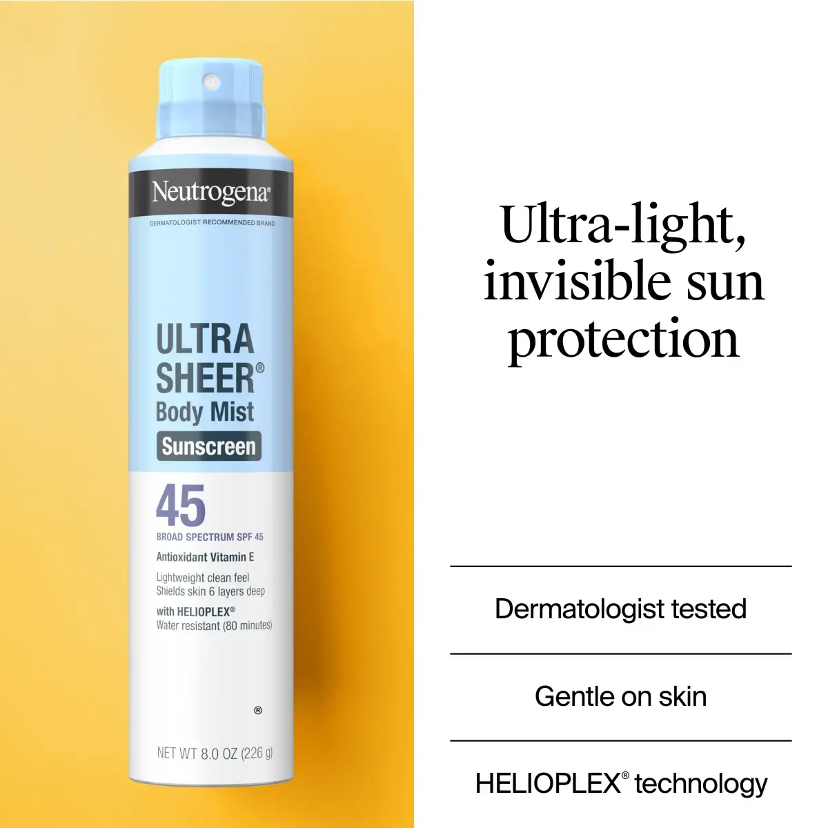 Neutrogena Ultra Sheer Dry Touch Sunscreen Spray SPF 45, Broad Spectrum sunscreen mist provides powerful sun protection & skincare benefits in a pleasing formulation that feels clean, light & easy to wear. Helioplex Technology creates a powerful shield of protection, withstanding the harshest of UV rays while supporting a healthy-looking complexion & radiance. Enriched with antioxidant vitamin E, the lightweight body sunscreen absorbs fast with Dry-Touch technology for an invisible, matte finish on skin. The non comedogenic sunscreen spray format provides a no-mess application for face and body. With a mild scent the spray sunscreen SPF 45 is PABA, paraben & dye-free. This Neutrogena sunscreen spray is water-resistant for up to 80 minutes & comes from a dermatologist recommended sun care brand. Apply this non-greasy sunscreen prior to sun exposure to keep skin protected as you enjoy your daily dose of sunshine: at the beach, on a trail, or during your everyday routine.